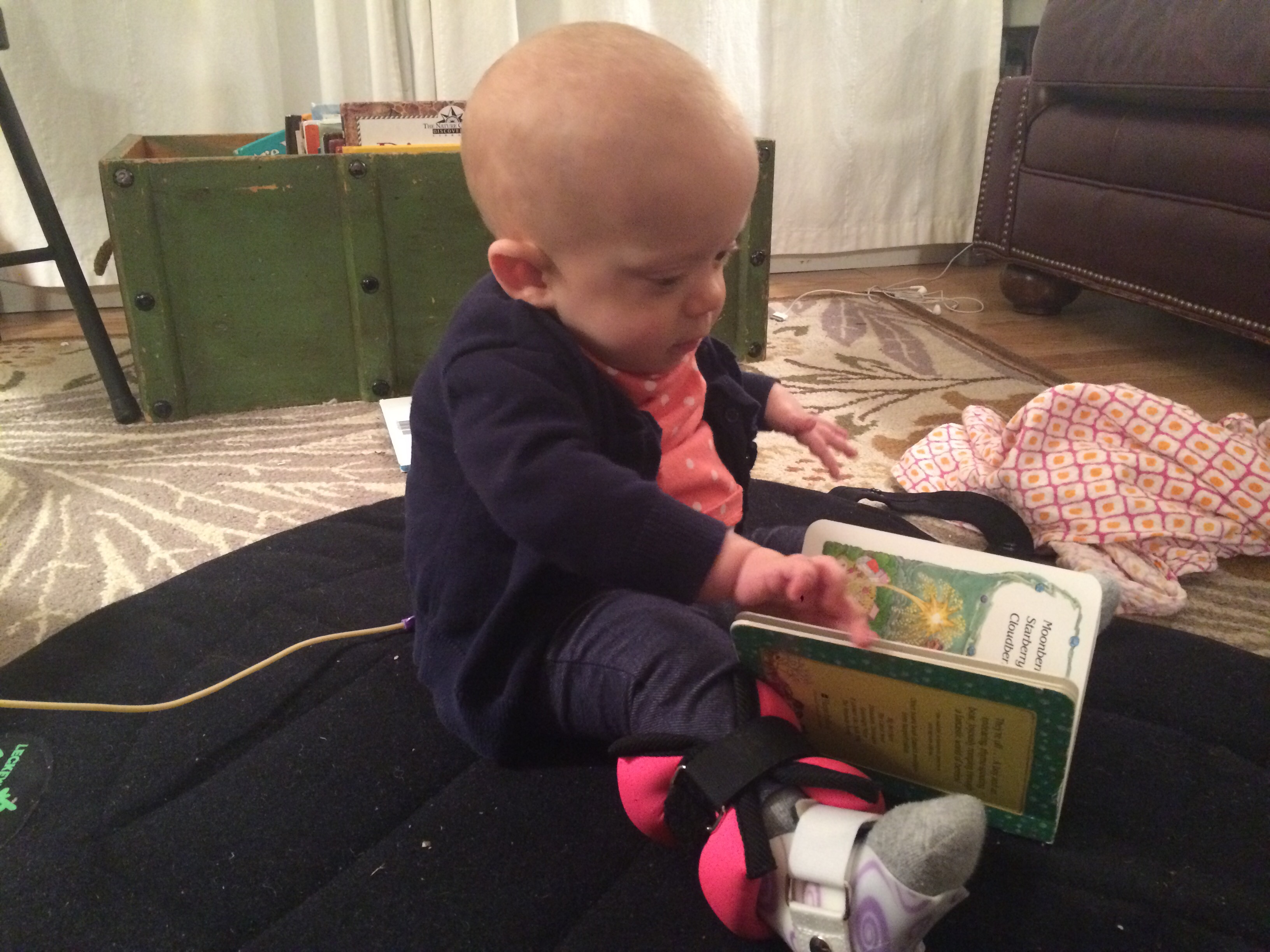 Mary has been working hard at learning to sit. It’s taken months of work but she’s made so much progress! And now she seems ready to graduate. She’s starting to sit without any prop or support. We keep her on a soft surface so that she doesn’t get hurt when she falls since she doesn’t know how to catch herself. She has to work pretty hard at staying upright, but she clearly enjoys the freedom. Currently the main help she needs is 2 weights we attach to her ankles. This basically just helps offset the weight of her head, which is considerably larger proportionately than her body. It’s so fun for her to gain just a little bit of independence.