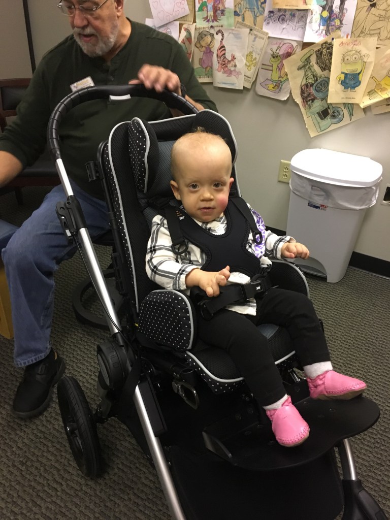 This has been in the works for quite a while. While Mary isn’t the most obvious candidate for an adaptive stroller, this is a major upgrade for her and very helpful overall. She can support herself decently on a solid surface. But strollers aren’t very solid and Mary generally ended up pretty slumped over in hers and the buckles were hard and uncomfortable and attached right where her g-tube is on her belly. Plus, she wasn’t up high enough for easy interaction and she was fairly enclosed in her old stroller. Now, she’s very well-supported, up higher, and sits with good posture. She seems thrilled with the change and so are we. She immediately seemed more comfortable interacting with people and it feels easier to take her places with such a safe, comfortable place for her to be.