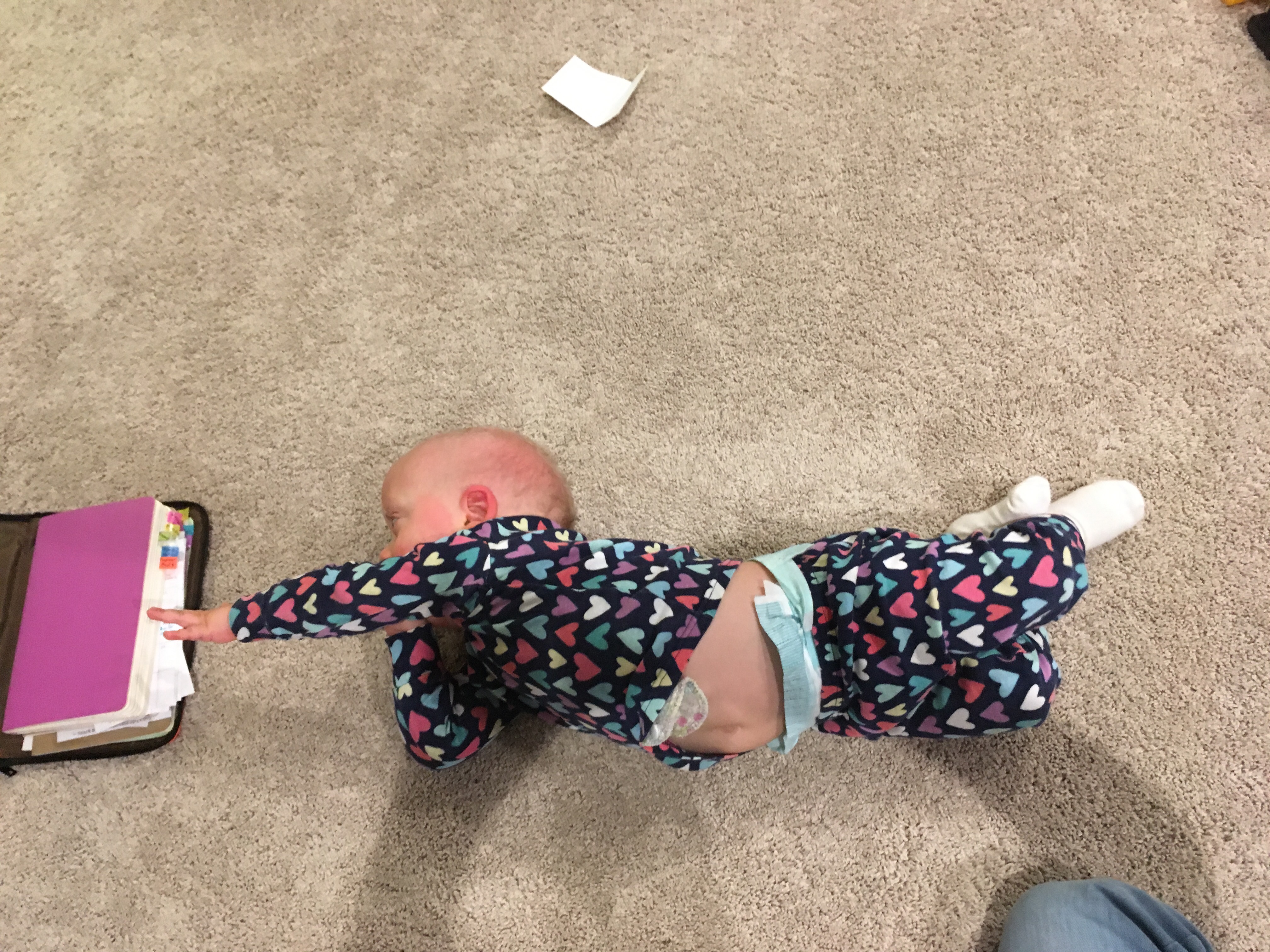 Rolling and floor time have consistently been hard to work on with Mary. Her reflux is still a huge limiting factor. And with how challenging growth is for her, we can’t risk making her vomit. Recently I’ve been trying to find low stress ways of having her on the floor more and trying to let her work on these skills on her own because physically maneuvering her always upsets her so much more. Well, last night for the first time she started rolling halfway over in an attempt to get my things as I worked next to her! And just now as I was writing this sitting on the floor next to her, she rolled back to front and then back again!!! This really is monumental for her. It’s only been pretty recently that we’ve seen her even attempting to cross the midline at all or use both hands at once. Rolling over is a wonderful way to practice this skill and an extremely important stimulation of neurological pathways!